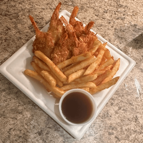 Breaded butterfly shrimp with house fries and honey garlic sauce