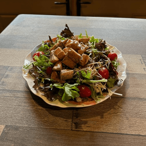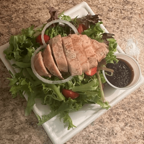 Freshly prepared organic spring mix, sweet onions, cherry tomatoes with antibiotic-free grilled chicken and choice of dressing